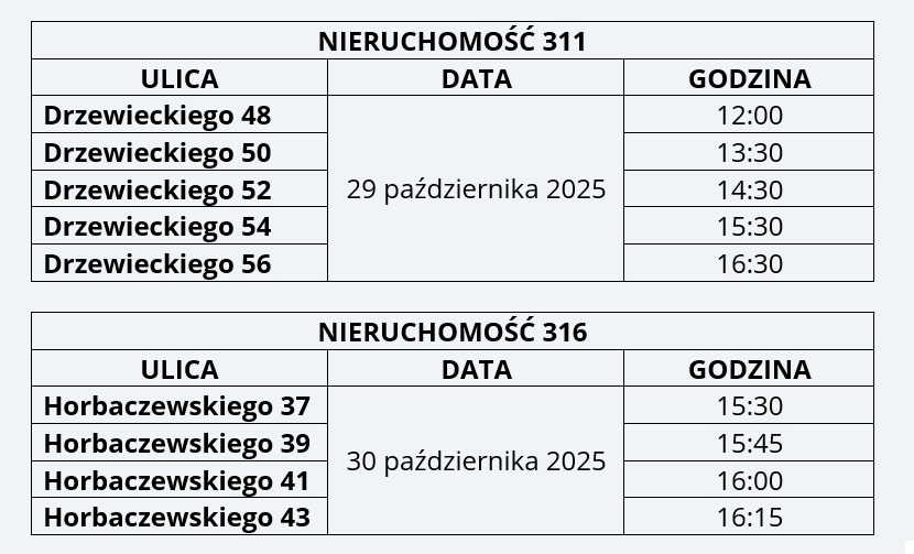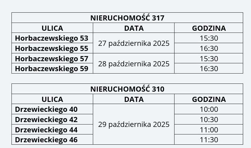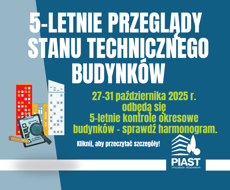 Informujemy, że w dniach 27–31 października 2025 r. przeprowadzone zostaną 5-letnie kontrole okresowe stanu technicznego następujących budynków: