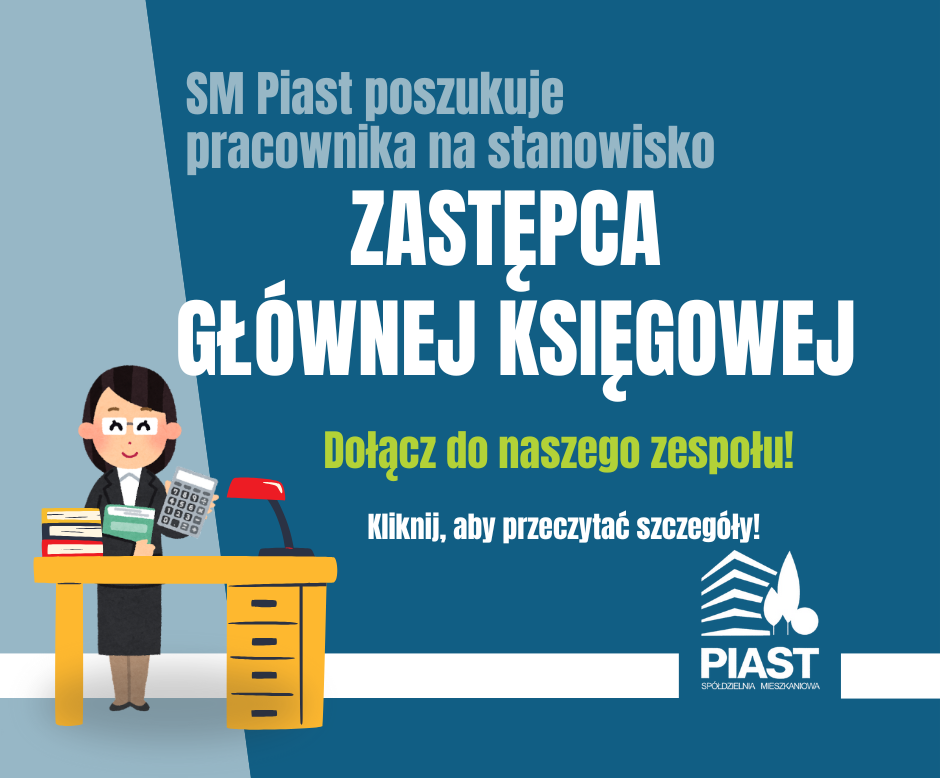 Spółdzielnia Mieszkaniowa „Piast” we Wrocławiu poszukuje zastępcy głównej księgowej. Oferowana forma zatrudnienia to umowa o pracę na pełen etat.