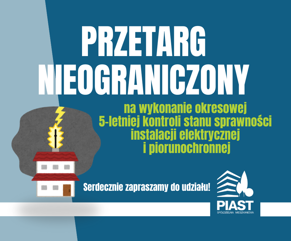 Spółdzielnia Mieszkaniowa „PIAST” ogłasza przetarg nieograniczony na wykonanie okresowej (pięcioletniej) kontroli stanu sprawności instalacji elektrycznej i piorunochronnej w obiektach budowlanych Spółdzielni Mieszkaniowej „Piast” we Wrocławiu. (Gądów – Osiedle III i V oraz Bystrzycka 69c).