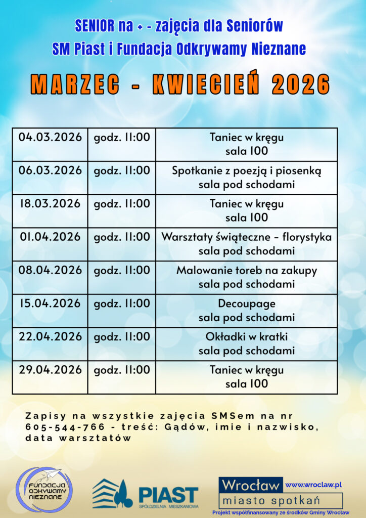 Zajęcia odbywać się będą w siedzibie SM „Piast” sala 100 oraz „Klub pod schodami”, ul. Bulwar Ikara 18-20, (z tyłu za apteką Helvetia)