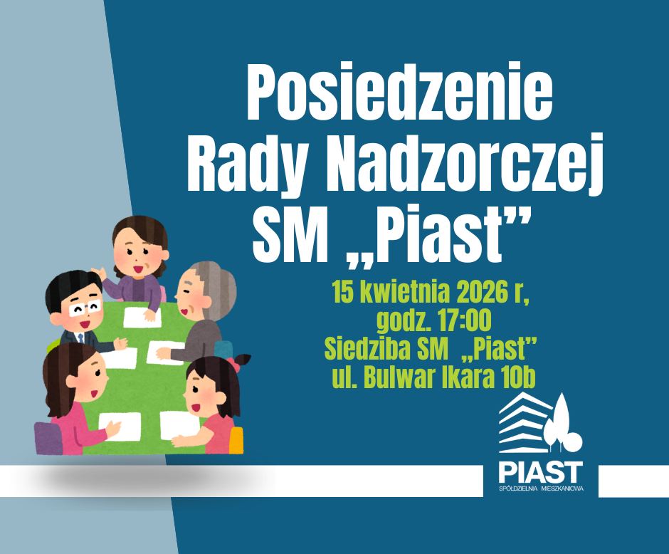 Informujemy, że 15 kwietnia 2026 (środa), o godz. 17:00 w siedzibie Spółdzielni SM „Piast” przy ul. Bulwar Ikara 10B, sala 100 odbędzie się posiedzenie Rady Nadzorczej SM „Piast”.